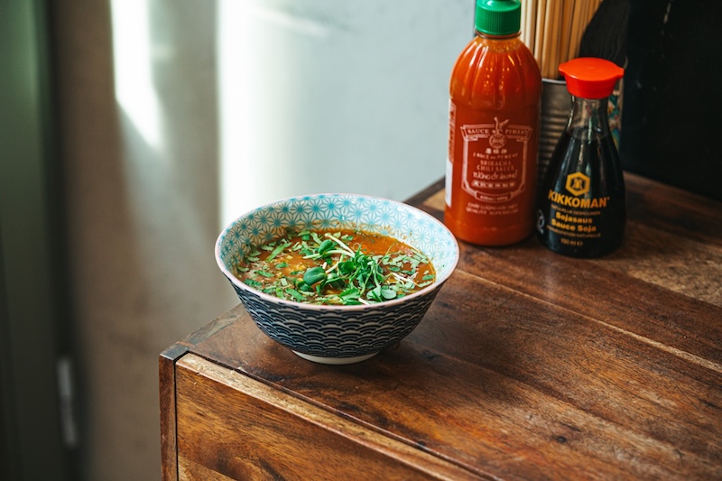 Japanische Weizennudeln & Gemüse, Brühe mit Sojasauce